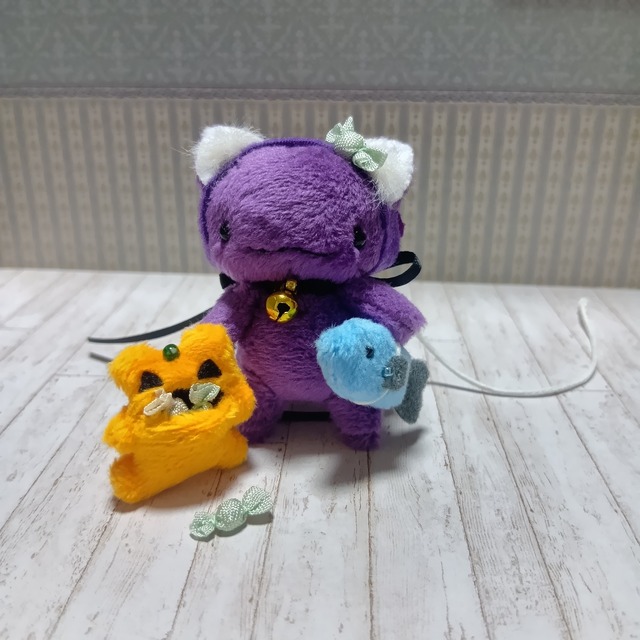 こちらの商品は先着販売です。 ※「~のぬいぐるみ」と記載のある商品の購入は原則、 【1週間に1個まで】とさせて頂いております。 月曜日~日曜日間に注文した履歴のある方からの追加購入はご案内無くキャンセル処理をさせて頂きます。 ウーパールーパー風ぬいぐるみ本体1点・ミニぬいぐるみ・猫耳のカチューシャ・フェイク飴玉3個、鈴付きリボン・魚の猫じゃらしのセットです。 本体詳細 背丈:約5cm 横幅:約2.5cm 尾の長さ:約4cm 猫耳のカチューシャ脱着の際は頭のポンポンの破損に十分にご注意をお願い致します。 ※ハンドメイド品の為、大きさにばらつきがございます。 芯材・ボタンジョイントにより腕・尾が可動します。 ※各小物は着用したままにしておく場合、毛が寝てしまう可能性がございます。 ※芯材は中で縫い止めてはおりますが、何度か可動をさせると場合により内部でずれてしまう可能性がございます。 ※腕のボタンジョイントは何度も回転させる等の負荷を与えると内部で糸が切れる等の破損をする恐れがございます。可動は上下までに留めて下さい。 ※鰭にはオーガンジーを使用しており、糸吊れや裂けが起こりやすくなっています。 ミニぬいぐるみ 縦約4cm 背面に大きく縫い合わせたあとが御座います。 オープンマウス仕様となり、付属の飴玉を取り出す事が出来ますが、再度収納する場合はピンセット等を用いて行ってください。 口には薄手の布を使用しており、無理に押し込む等破損に繋がりますので取り扱いにはご注意ください。 魚の猫じゃらし 約4cm+紐 紐はもやい結びをしており、輪の部分から魚パーツを外す事が出来ます。 接着をしておりませんので紛失にご注意ください。 洗濯不可。 ※ボタン・目玉等、細かいパーツが多くなっています。誤飲や怪我に繋がりますので小さなお子様の手の届かない場所へ保管して下さい。 ※宅急便コンパクトでの発送となります。