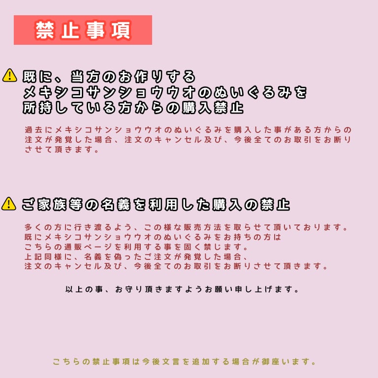 ⚠既にメキシコサンショウウオのぬいぐるみを所有している方の購入が発覚した場合は事前のご案内無く今回の注文をキャンセル及び、今後小物類含む全てのお取引をお断りさせて頂きます。
