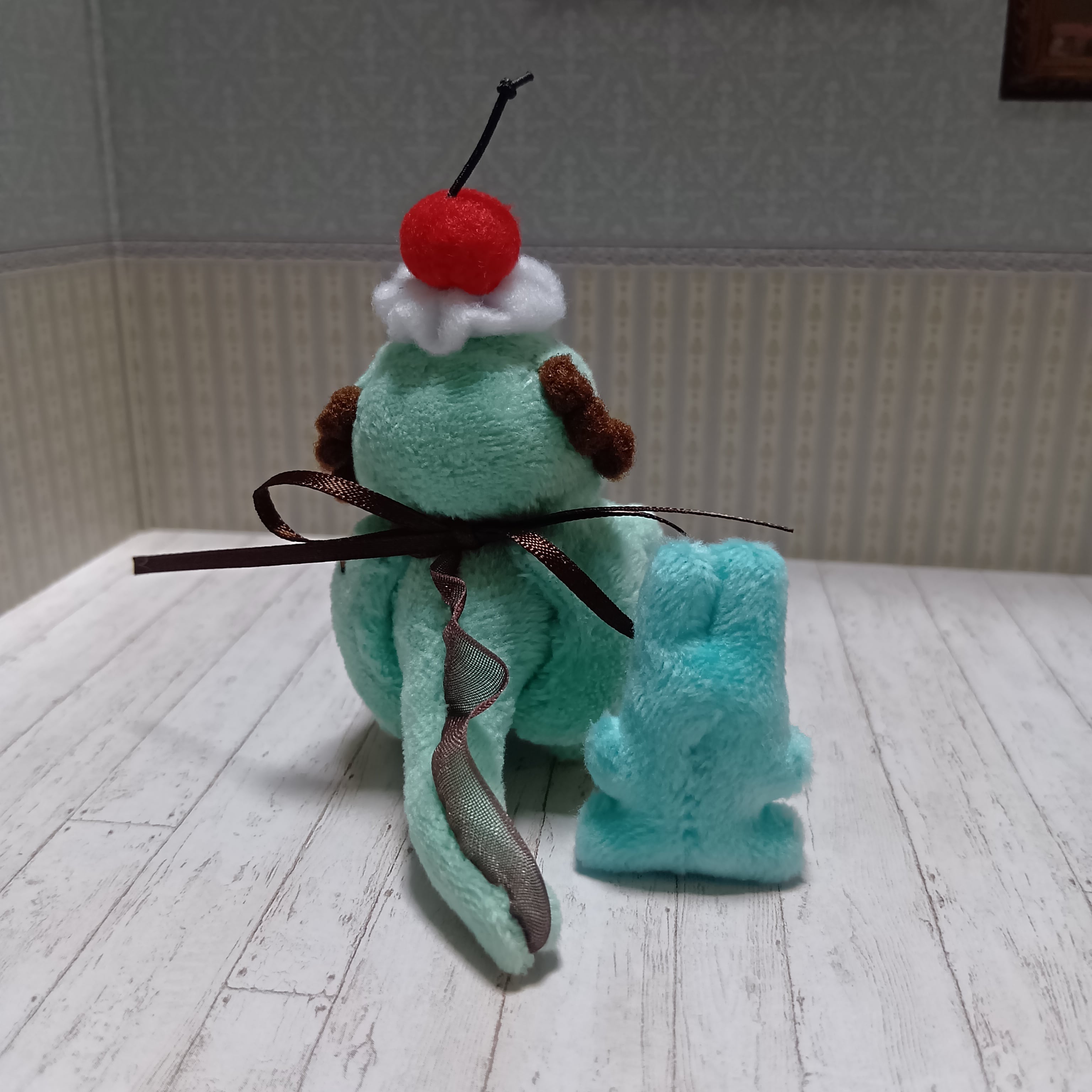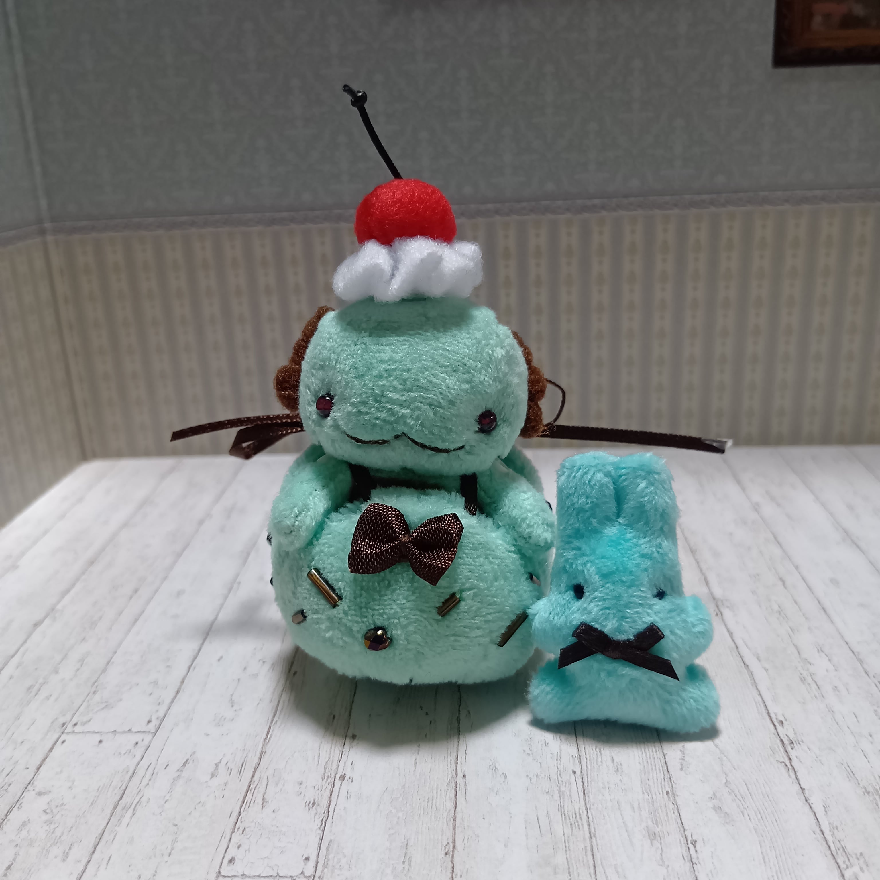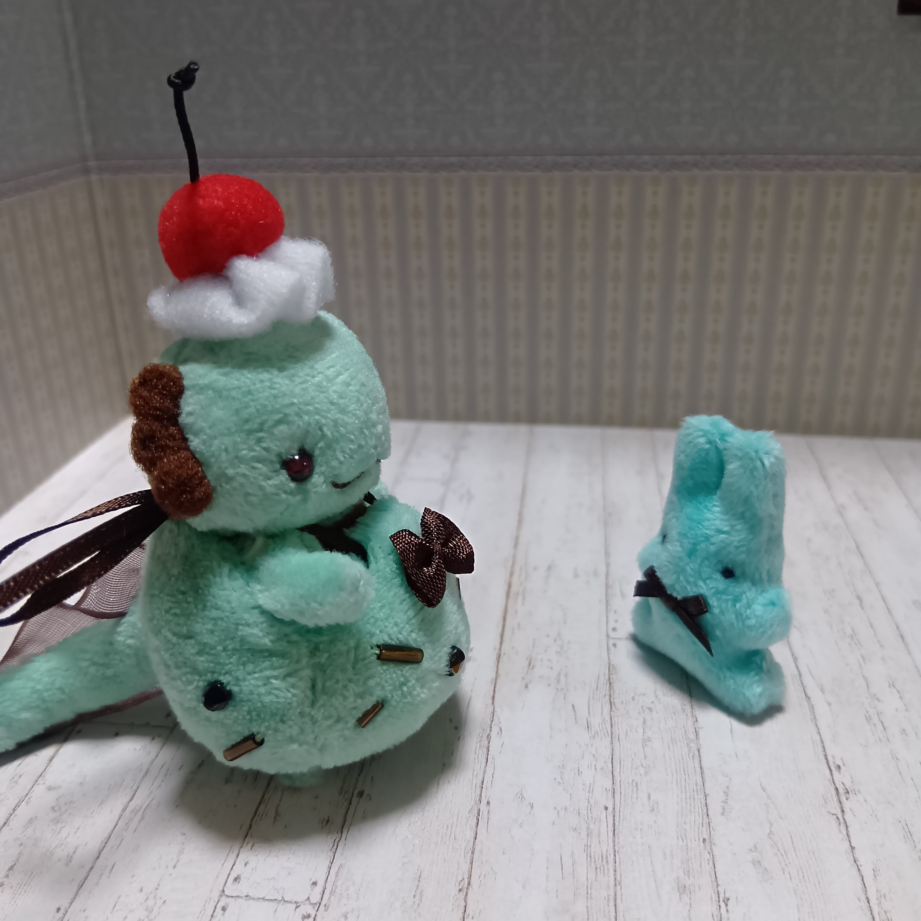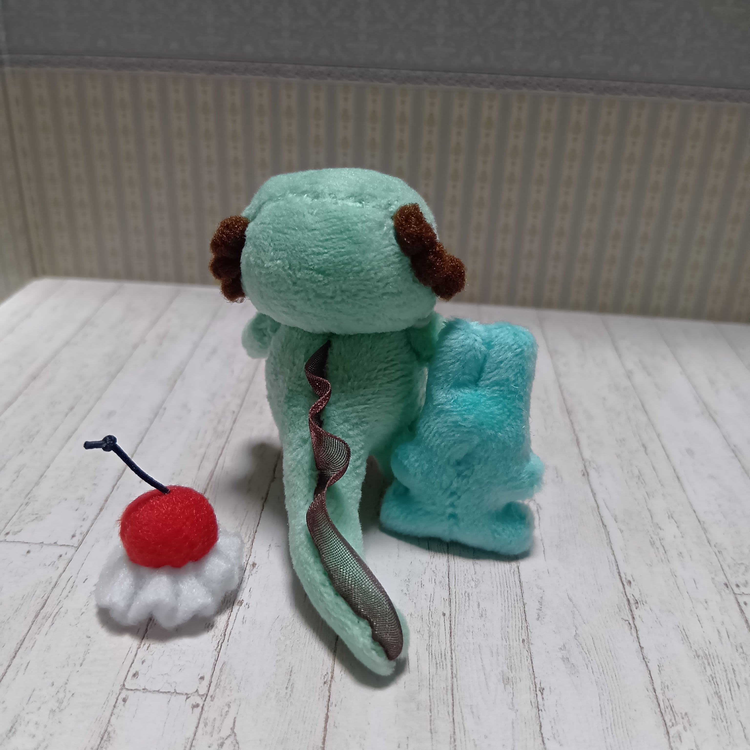 ウーパールーパー風ぬいぐるみ本体1点・ミニぬいぐるみ・磁石入り小物・チョコミントアイスのスーツ各1点、計4点のセットです。