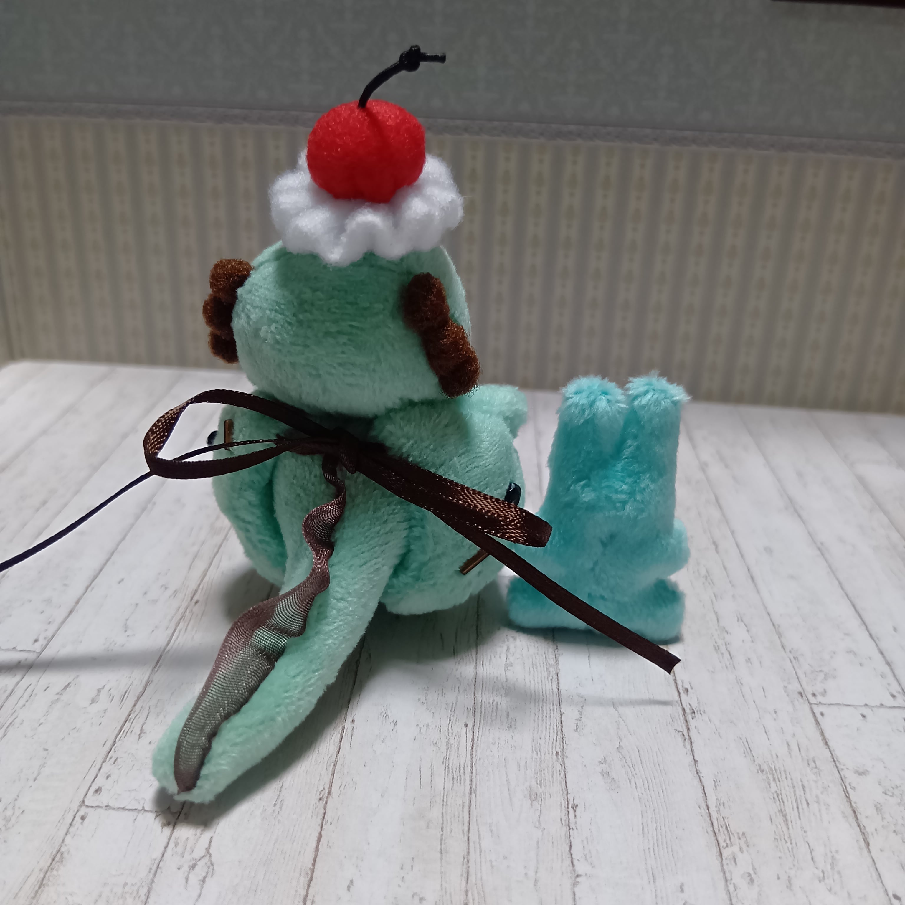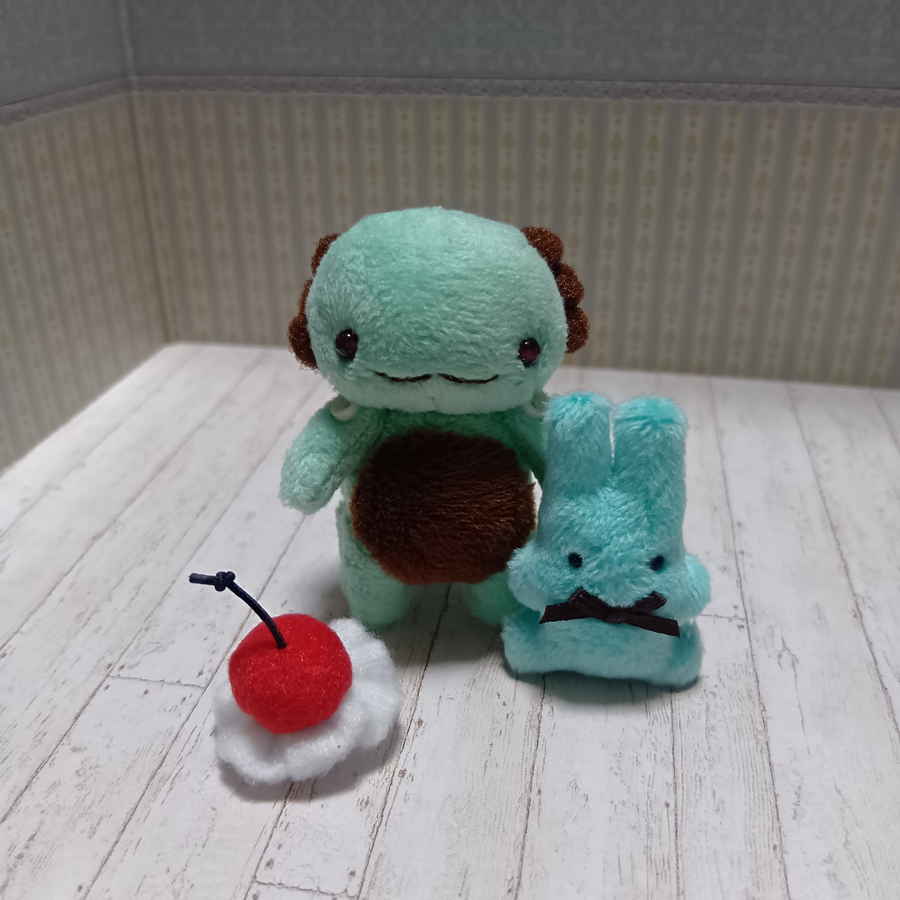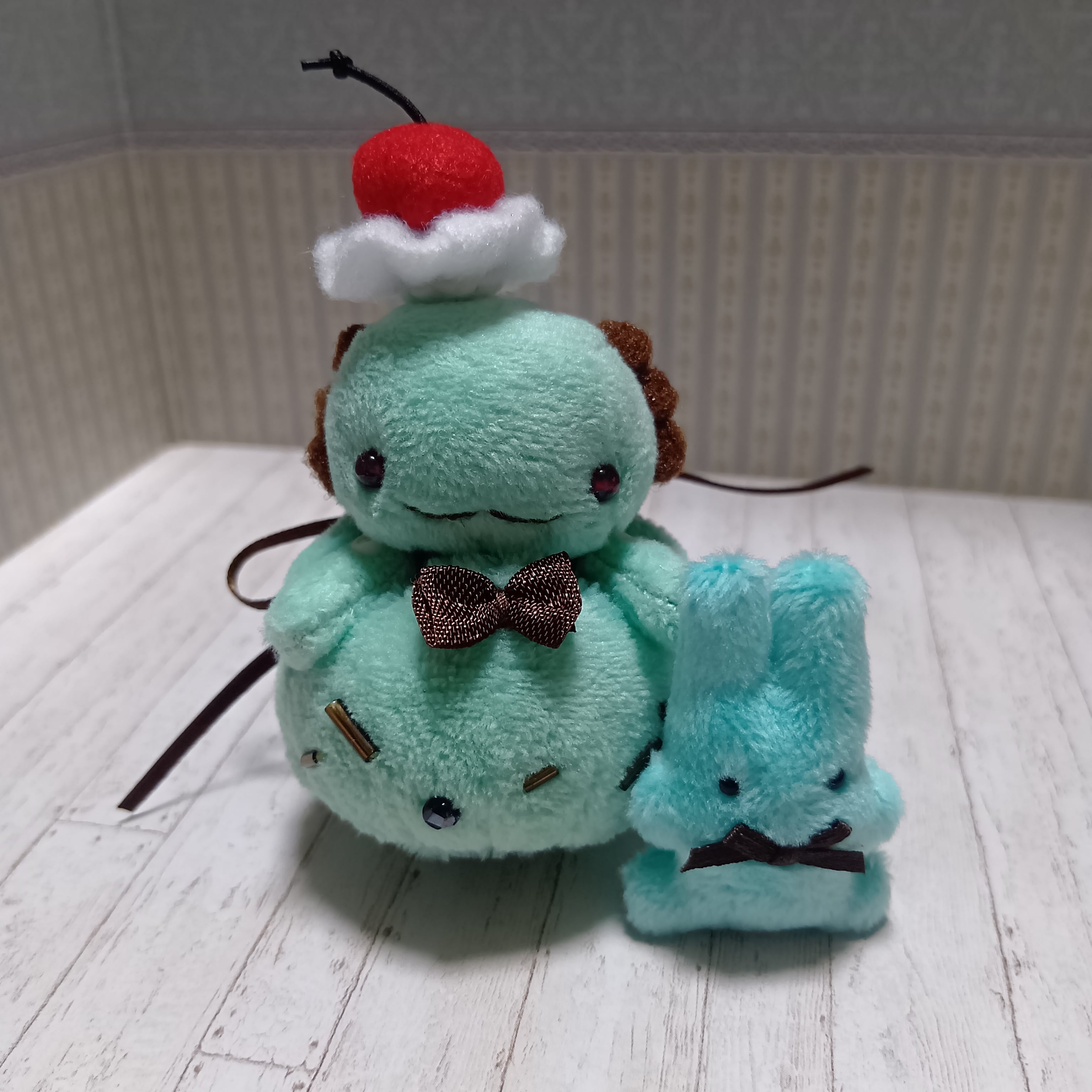 ウーパールーパー風ぬいぐるみ本体1点・ミニぬいぐるみ・磁石入り小物・チョコミントのスーツ各1点、計4点のセットです。
